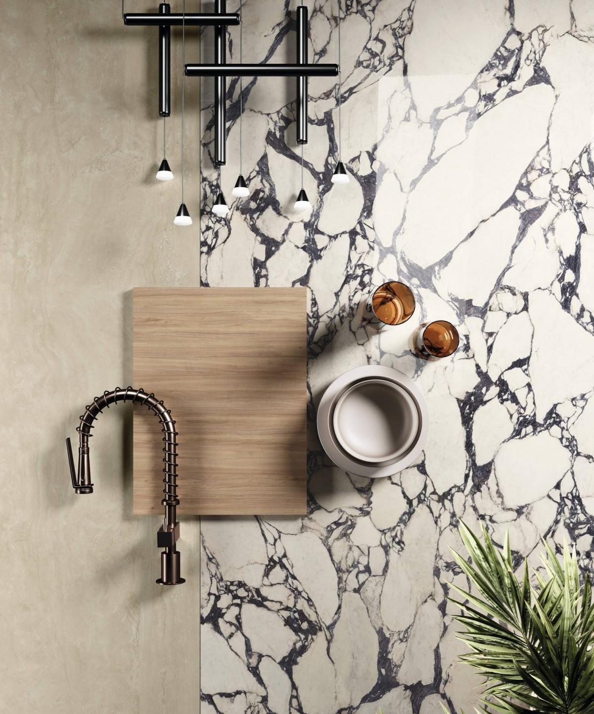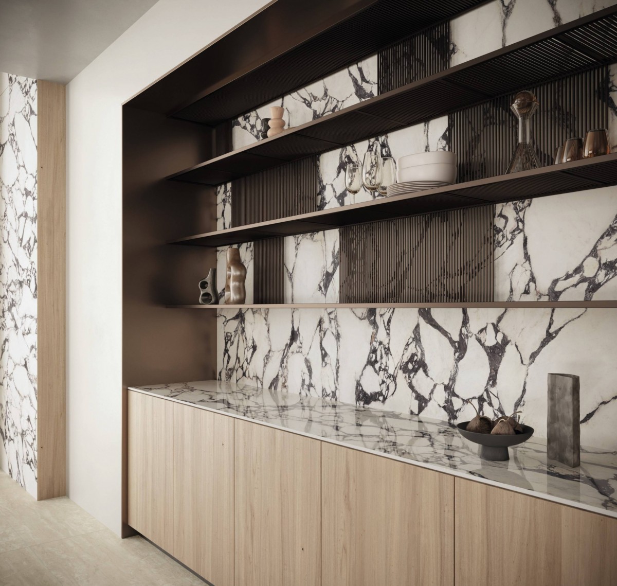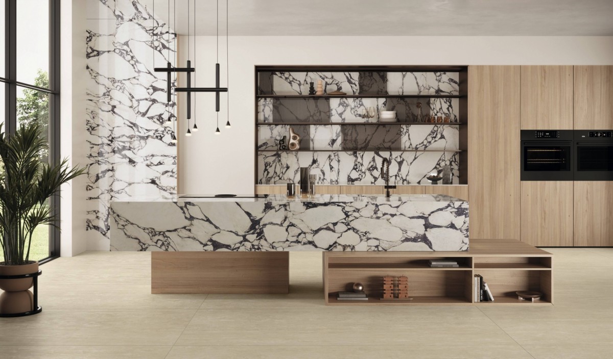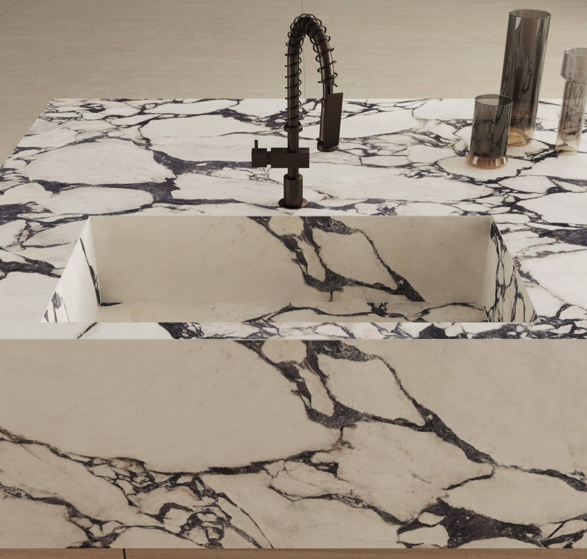 Calacatta Viola stands out for its warm white background and intense purple veining. This contrast creates a fascinating visual effect, capable of enriching any environment with a touch of elegance and personality.