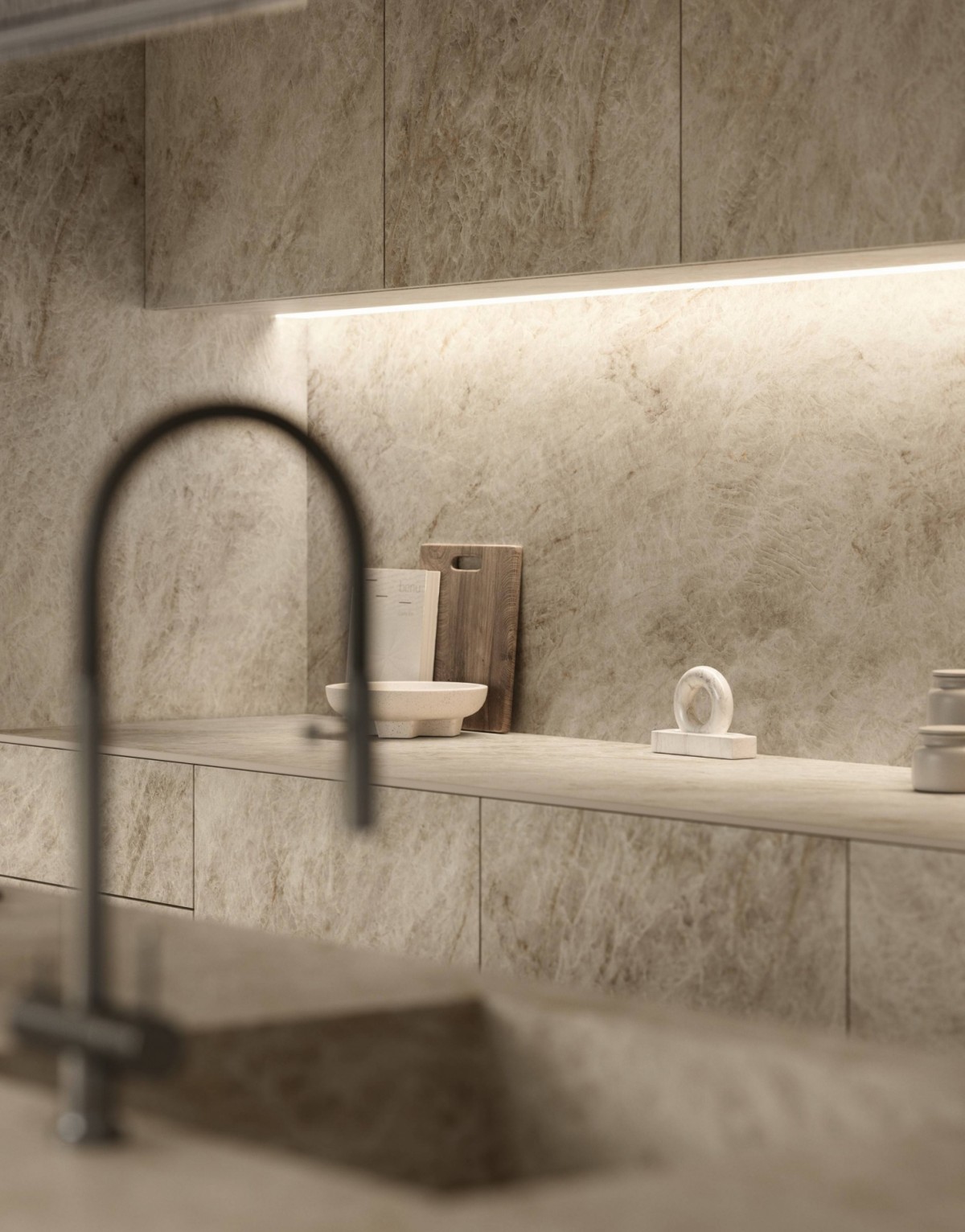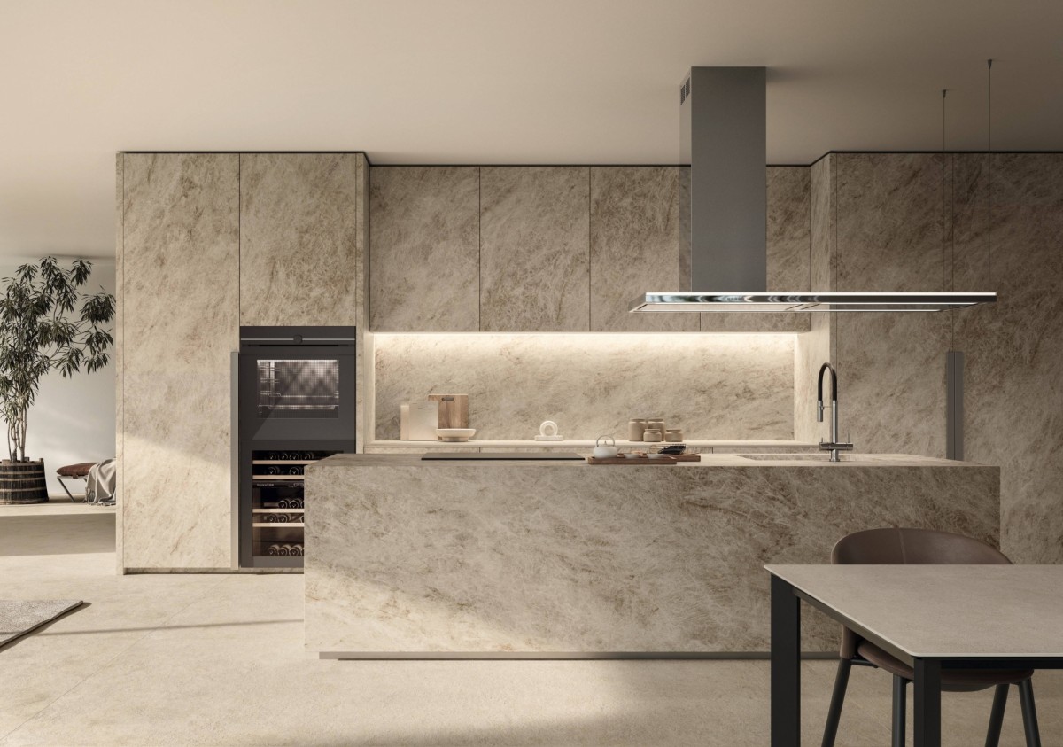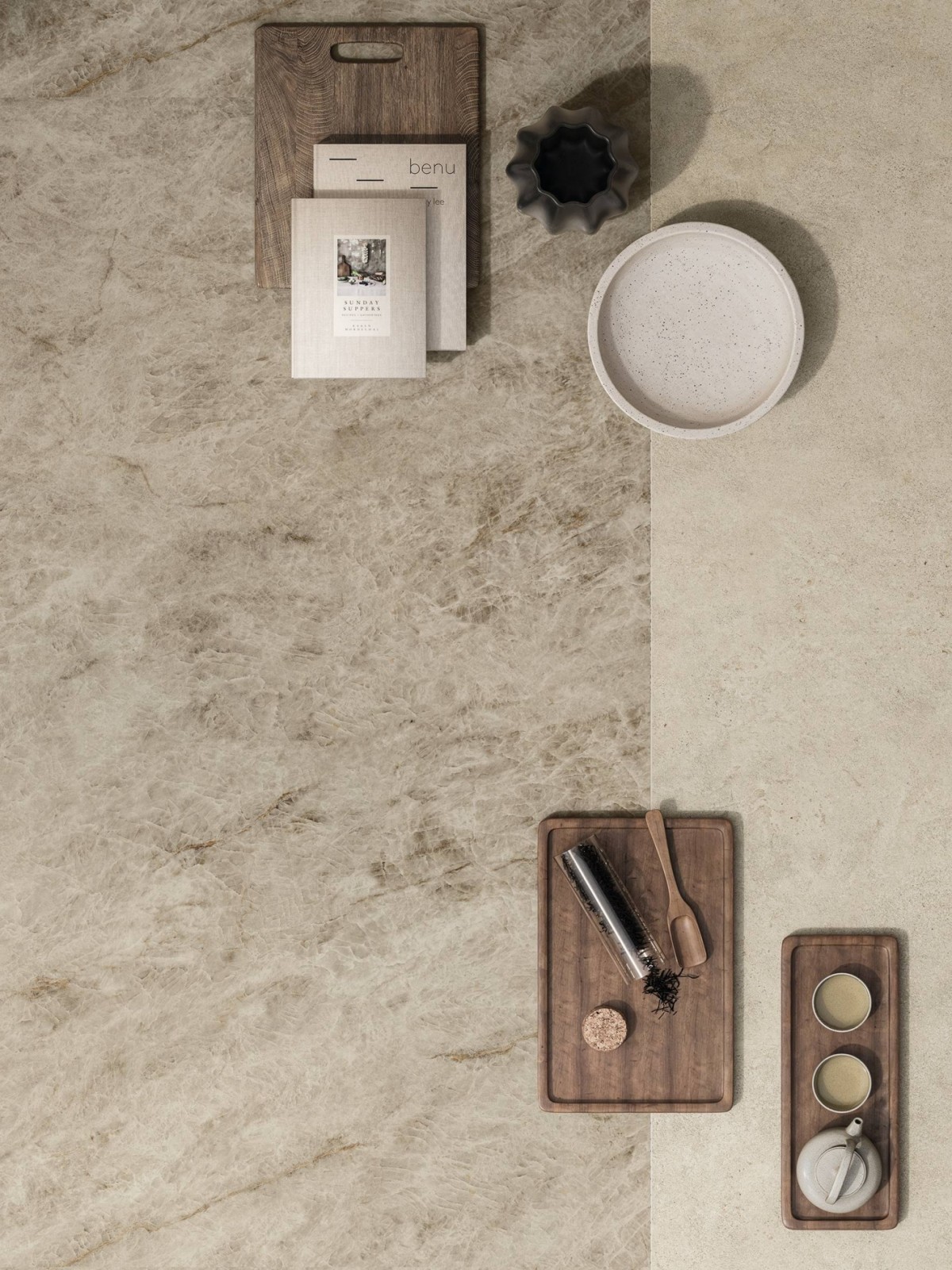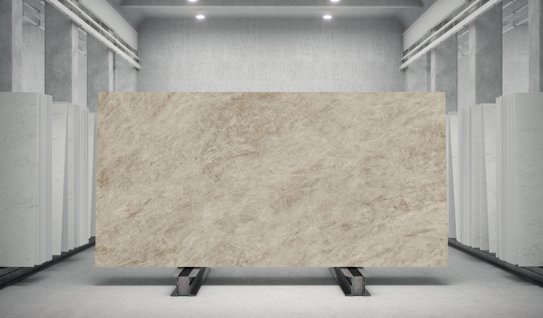 Taj Mahal Noisette is a material with warm tones and shimmering veins, offering a luxurious and elegant design, ideal for understated settings with exotic touches.