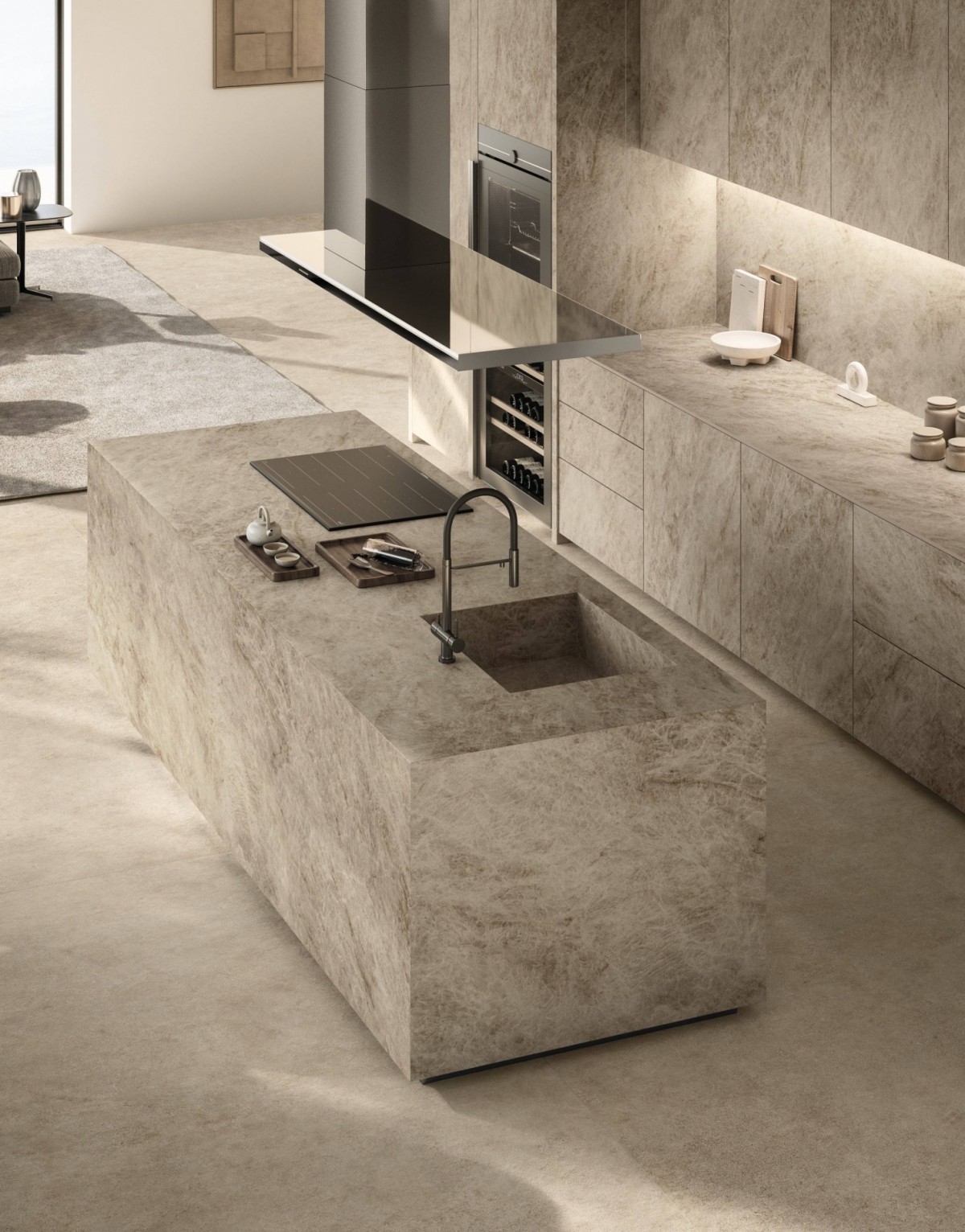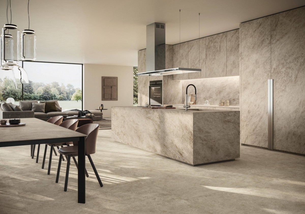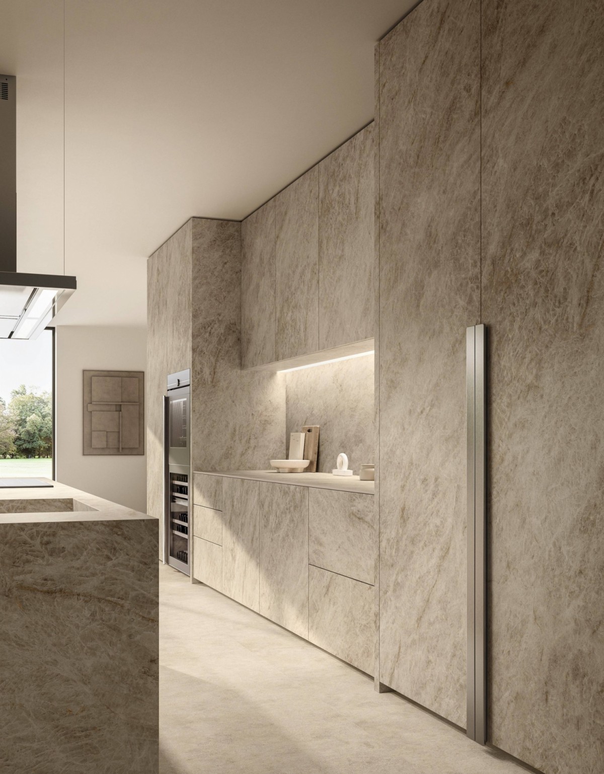 Taj Mahal Noisette is a material with warm tones and shimmering veins, offering a luxurious and elegant design, ideal for understated settings with exotic touches.