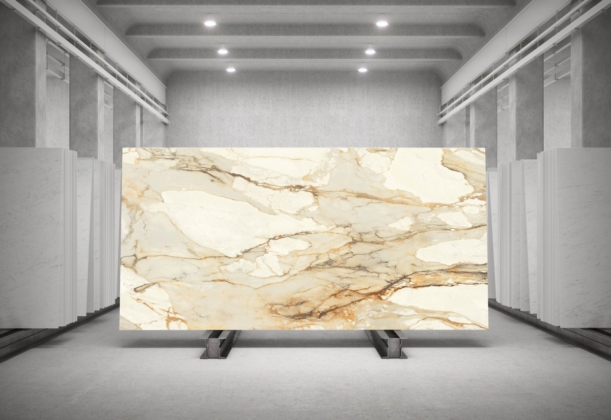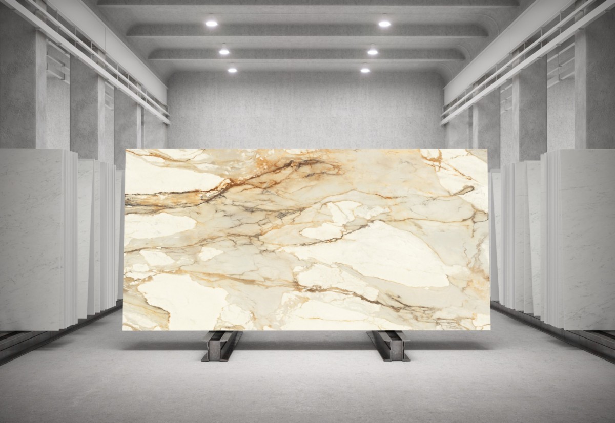 Fundo branco marfim num efeito mármore com veios de tons quentes. Máximo requinte e gosto com um toque de ousadia.