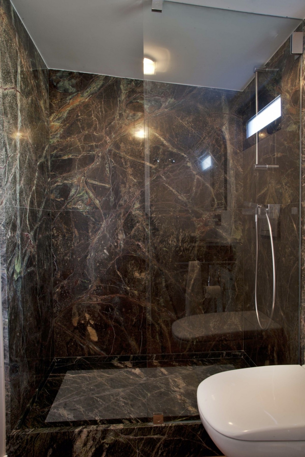 O último espaço de banhos é todo ele mistério e classe: o mármore Forest Green no pavimento, nas paredes e no lavatório suspenso com o nosso design único.