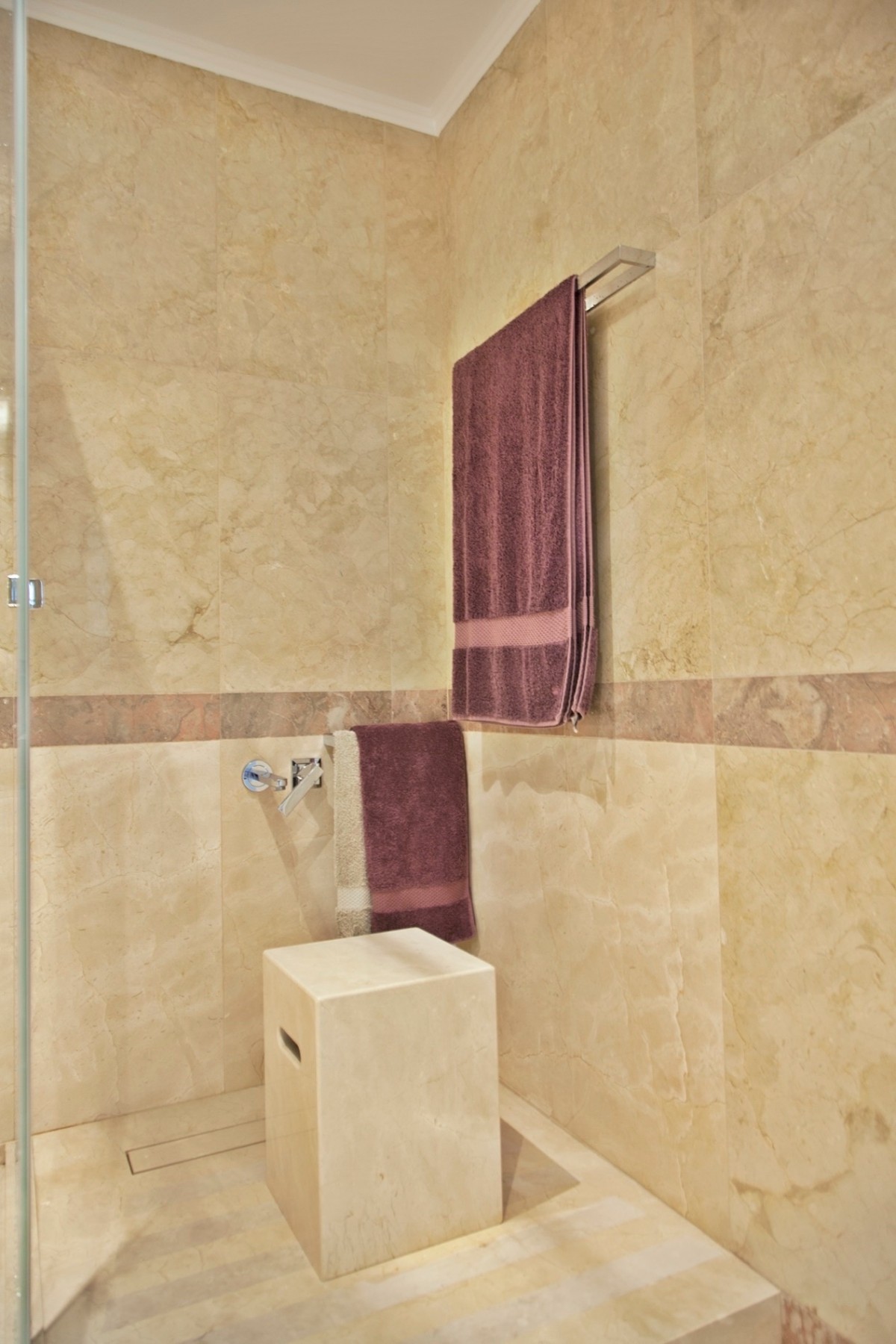 O cliente pediu também uma casa de banho totalmente revestida a Travertino Romano (pavimento, revestimento e tampo). A base de duche no mesmo travertino foi jateada a areia para a tornar antiderrapante.