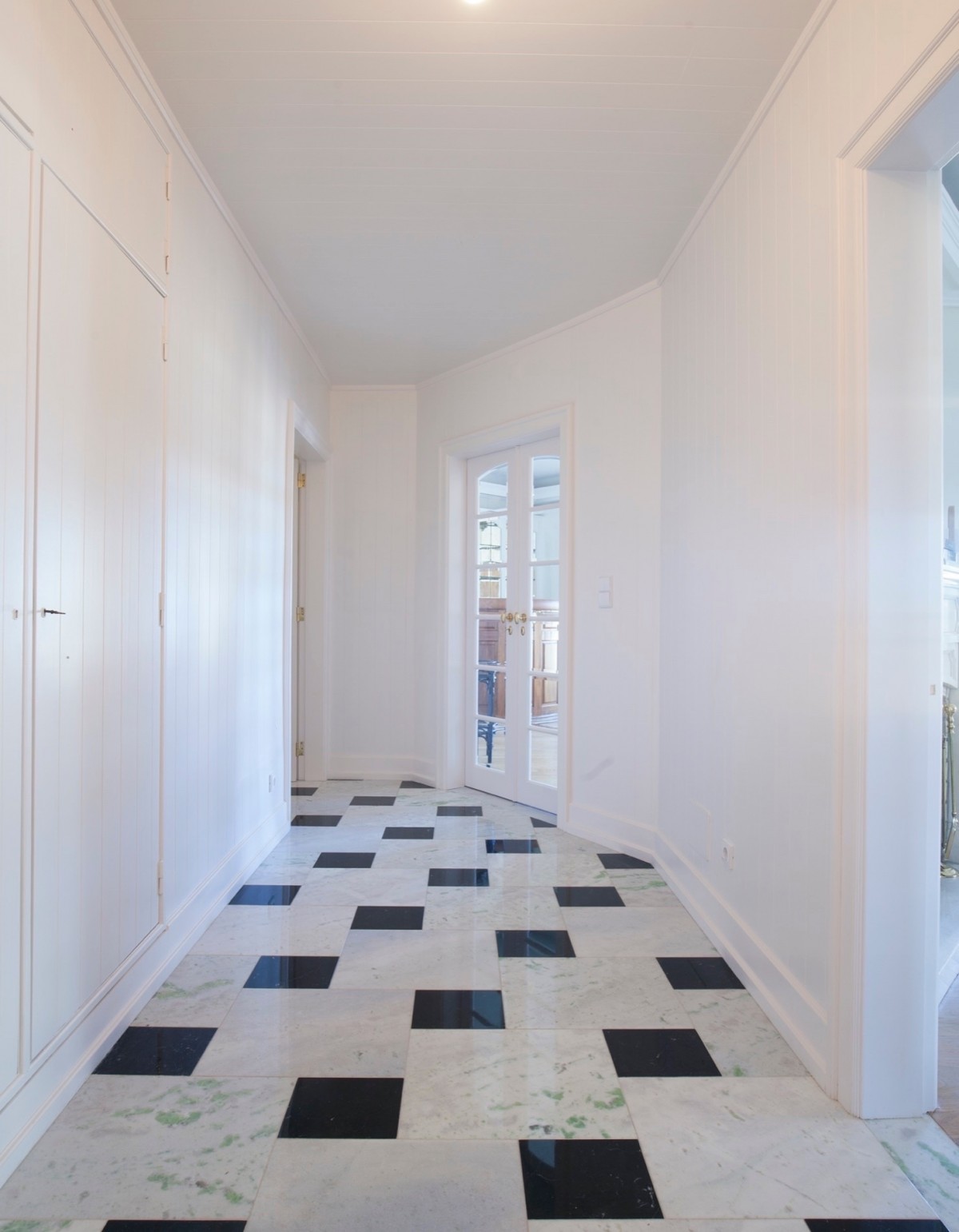 A cliente fez um pedido fora do comum: um pavimento "quase xadrez" entre os mármores Negro Marquina e Tropical. Este pavimento acompanha todo hall e corredor da casa. Leva-nos para uma cozinha branca imaculada em Branco Thassos: pavimento, revestimento e bancadas.