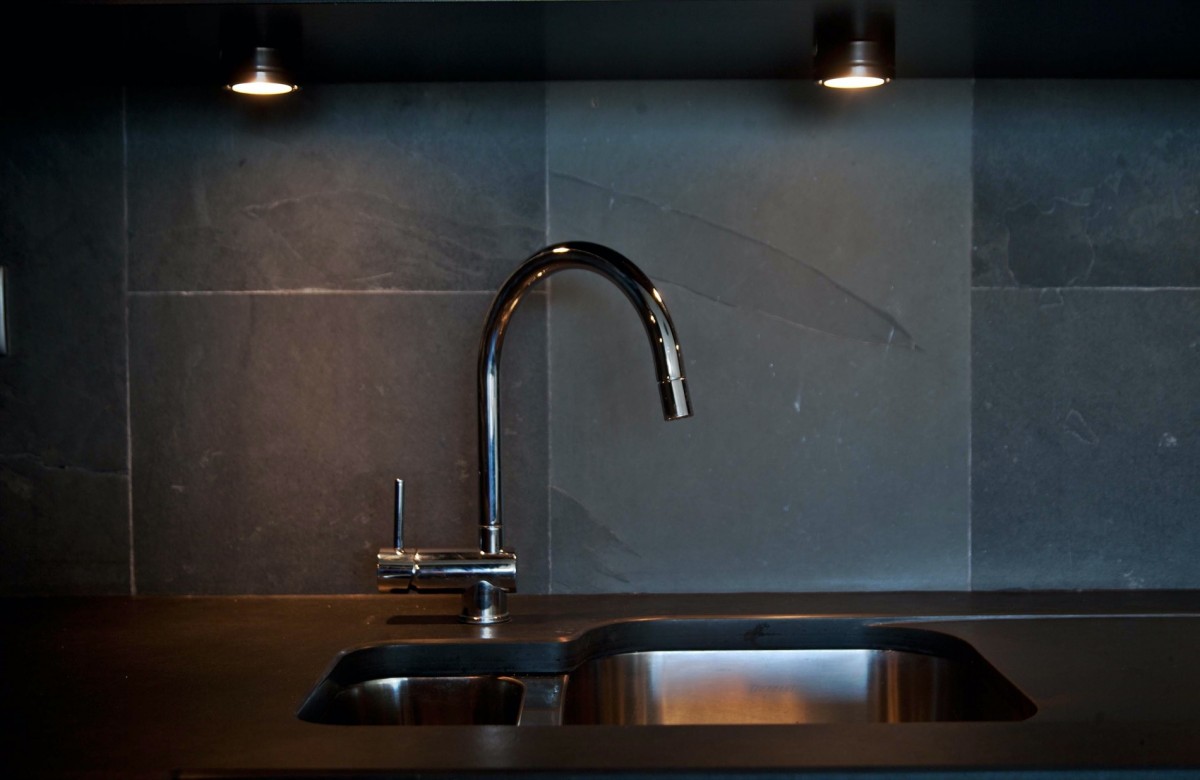 O cliente escolheu exclusivamente a Ardósia Preta para revestir as paredes, o pavimento e a bancada da sua cozinha. O resultado é de grande elegância.