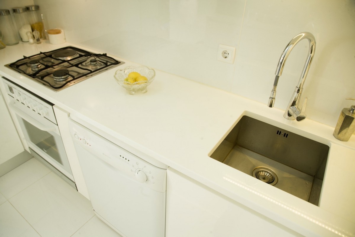 Opte pelo Glasstone Branco como nesta cozinha em Lisboa: uma superfície perfeitamente branca para uma cozinha luminosa!