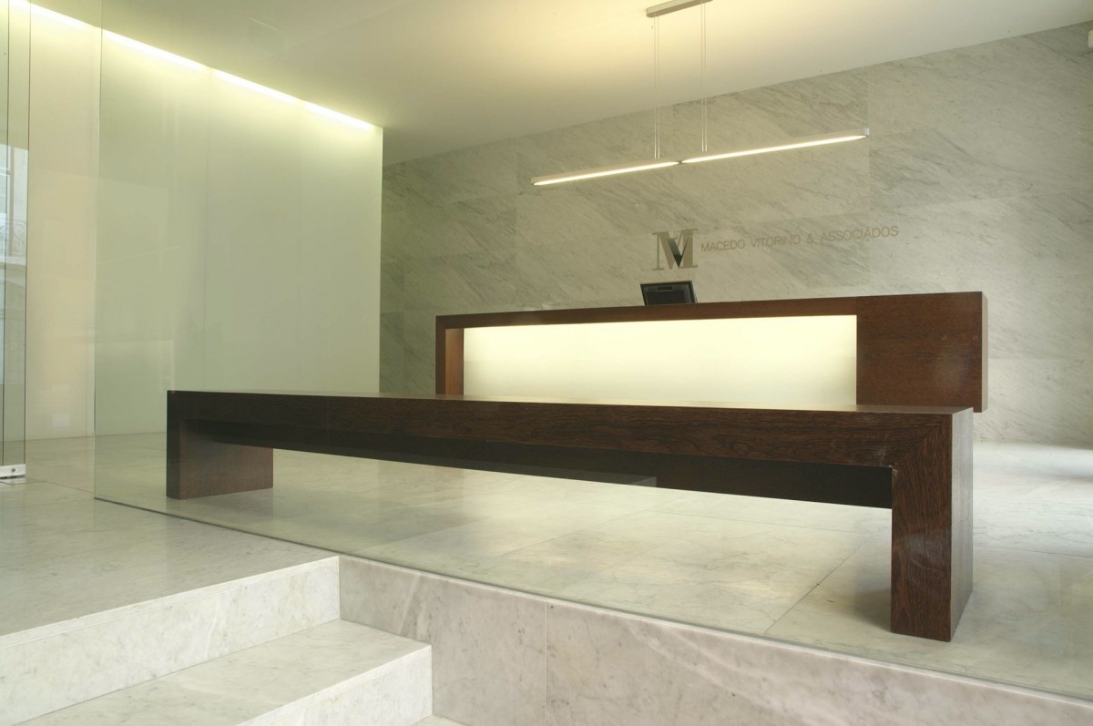 Nestes escritórios da prestigiada firma de advogados Macedo Vitorino & Associados, em Lisboa, o mármore Branco Carrara foi aplicado nos pavimentos gerais e alguns revestimentos de destaque.