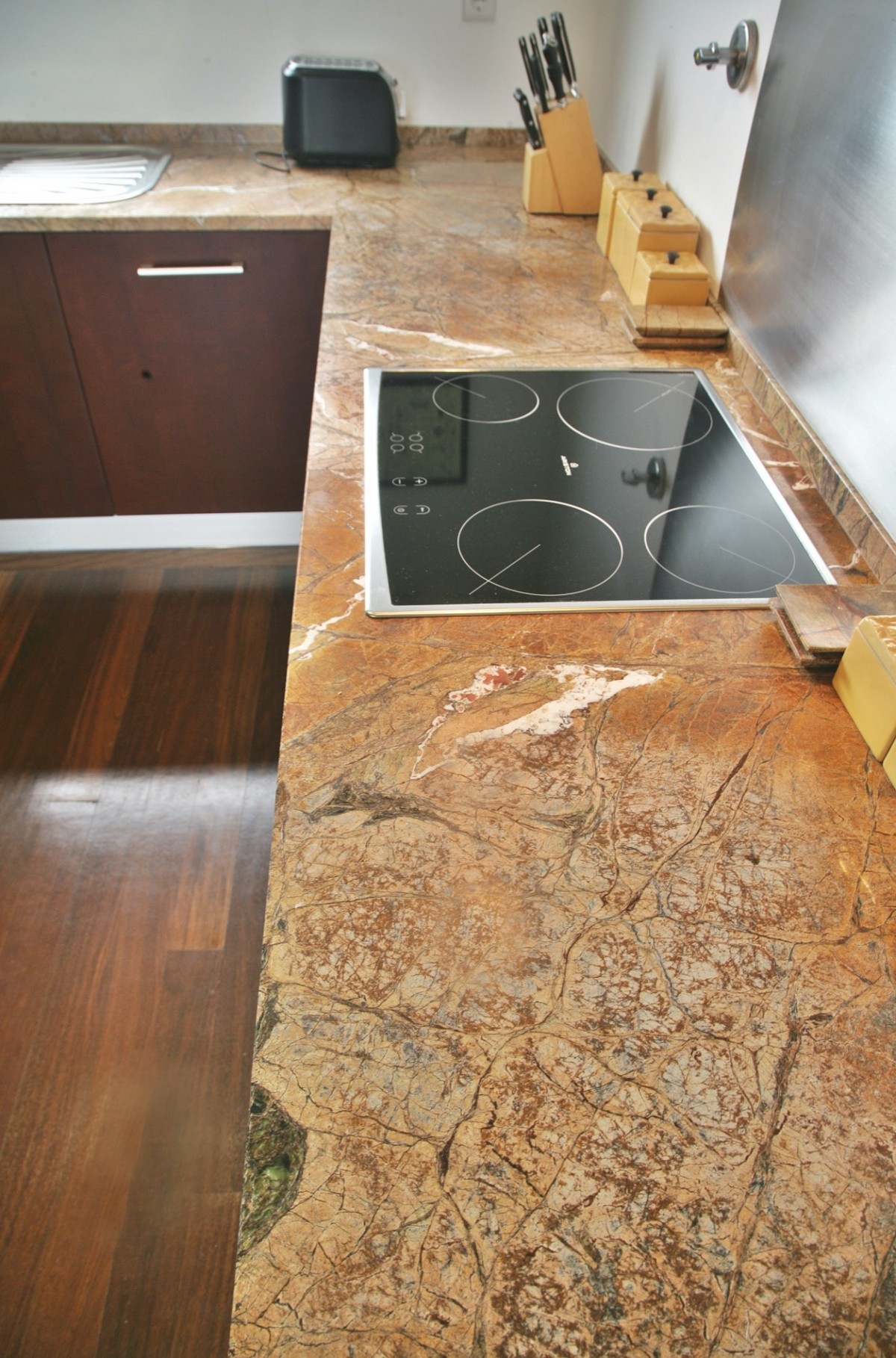 Para as bancadas desta cozinha em Sesimbra o mármore escolhido foi o Forest Brown. Extremamente decorativo e apaixonante, este material indiano é destacado pela conjugação com os móveis de madeira escura e o inox.