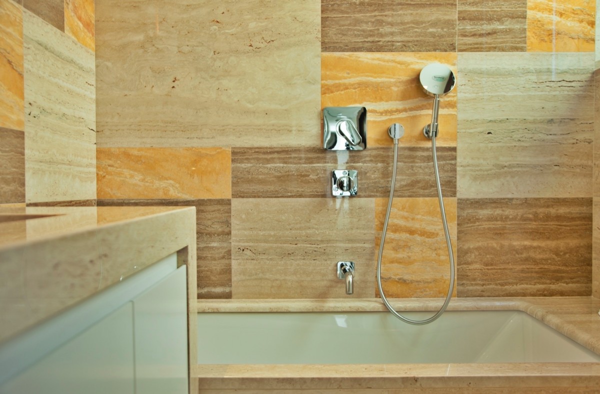 As casas de banho (nove no total) são palco para um jogo de cores em tons de travertino: Travertino Noce, mais acastanhado, Travertino Silver com os seus tons de cinzentos térreos, o Travertino Amarelo, solarengo, e ainda o Travertino Encarnado, qual tijolo avermelhado. Sempre acompanhados do Travertino Romano, neutro e naturalmente obrigatório, e tudo no acabamento resinado e polido.