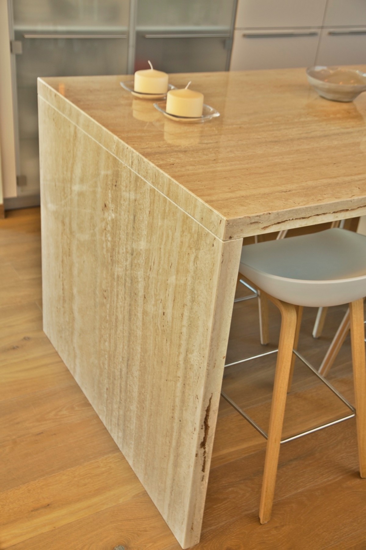 O Travertino Romano, intemporal e inevitável, acompanha toda a residência: começa no revestimento exterior das fachadas, continua no chão e paredes das casas de banho, segue pela generosa ilha de cozinha, e termina nas prateleiras da sala, elementos maciços com rasgos à medida para iluminação led.