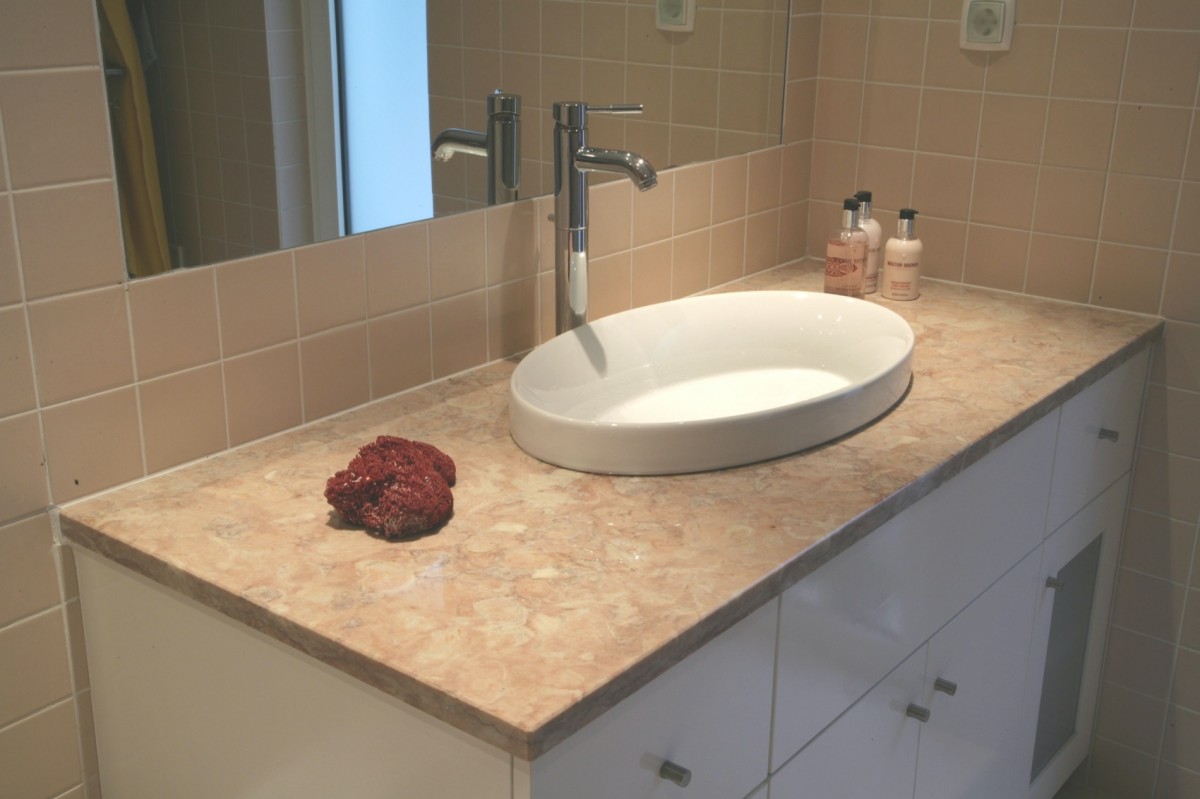 Para as outras duas casas de banho da moradia contribuímos com tampos em tonalidades condizentes com os azulejos que já estavam aplicados: um tampo no mármore Lioz St. Florient e um outro no mármore Rosa Aurora Claro.