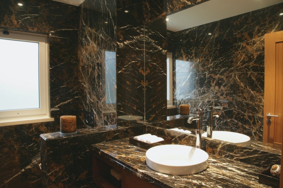 O lavabo social é das divisórias mais elegantes de toda a casa. Quem entra não se esquece de o ter visto. Toda revestida em Ouro Negro, um mármore de fundo quase preto fascinantemente raiado de dourados e brancos, esta casa de banho de visitas foi devidamente medida e desenhada por nós e fornecida em peças à medida: pavimento, paredes e tampo.